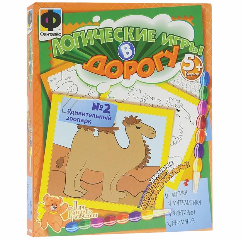 "Удивительный зоопарк" позволят вашему ребенку весело провести время. В комплект игры входит картонная подложка, два карандаша-конструктора, восемь карточек с заданиями и инструкция на русском языке. В наборе представлены логические игры различных типов: от точки к точке, раскраска по цифрам, лабиринт, раскраска по примерам. Логические игры в веселой и увлекательной форме способствуют развитию у ребенка аналитического мышления, формируют представления о соотношениях части и целого, учат выполнять действия по знаковым обозначениям. ЛОГИЧЕСКИЕ ИГРЫ ПОМОГАЮТ: Сформировать умения: - видеть логические связи и зависимости геометрических фигур - преобразовывать одни фигуры в другие ВЫПОЛНЯТЬ ПОСЛЕДОВАТЕЛЬНОСТЬ ДЕЙСТВИЙ: - выполнять действия по знаковым обозначениям - "читать" простую схему - определять последовательность выполнения действий - пользоваться простыми алгоритмами СФОРМИРОВАТЬ ПРЕДСТАВЛЕНИЯ: - об отношениях целого и части при делении предмета на несколько частей Учат видеть связи и зависимости между предметами: - по размеру, по форме, количеству, расположению в пространстве. В наборе представлены логические игры различных типов: - от точки к точке - лабиринт - раскраска по цифрам - раскраска с примерами В комплекте уникальные карандаши-конструкторы!