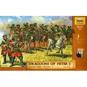 Набор из 10 неокрашенных конных и 9 пеших солдатиков. 4 отливки. Драгун, Майор, Знаменосец, Прапорщик и Барабанщик. Драгуны Петра успешно воевали как в конном, так и в пешем строю. Число драгунских полков достигло 33. Пик славы драгун Петра I приходится на битву при деревне Лесной, когда состоящий в основном из драгун Корволант стремительным маневром на большое расстояние перехватил шведский корпус Левенгаупта и в решительном бою разгромил его, не смотря на численное превосходство шведов. В битве при Полтаве драгуны успешно противостояли шведской коннице в начале сражения, в бою на линии редутов, а в решающей фазе сражения драгунские полки опрокинули шведскую конницу на флангах.