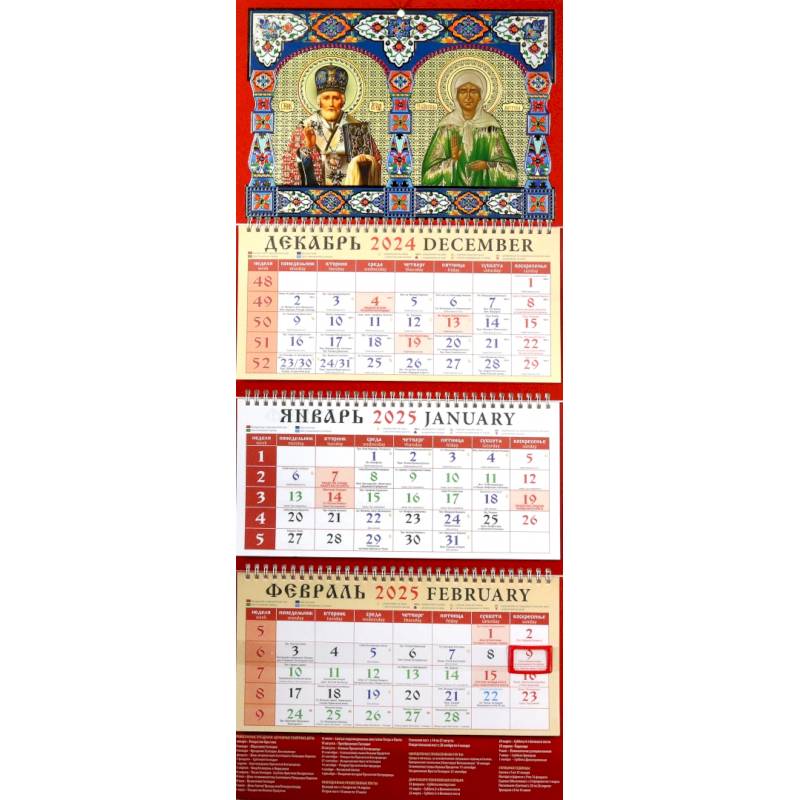 Православный календарь с указанием праздников, трапез и постов.