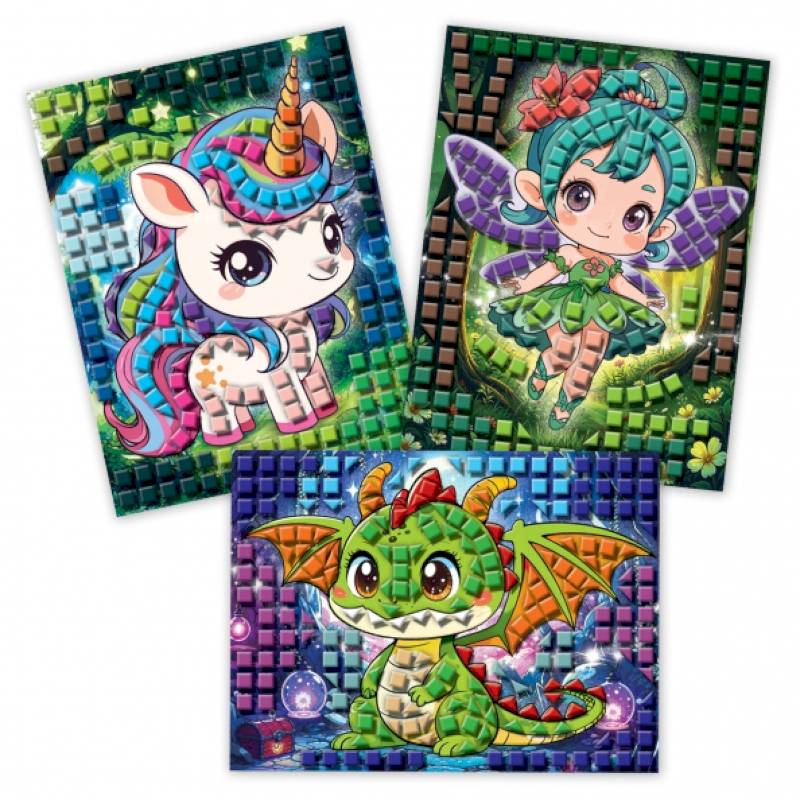 Детали мозаики выполнены в виде квадратиков из мягкого пластика ЭВА. Размер одного элемента – 7х7 мм. Работать с аппликацией очень просто – на основе уже отмечены места для приклеивания деталей, нужно подобрать подходящий по цвету элемент, снять его с общего блока и наклеить на картинку. Клей и ножницы не понадобятся! Ребёнок легко справится самостоятельно, помощь взрослого будет сведена к минимуму. В итоге у ребёнка получатся три эффектные картинки.