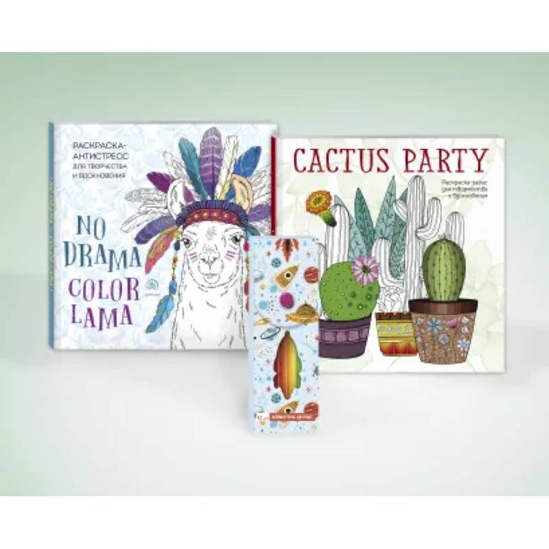 В этом подарочном наборе вы найдете две раскраски ('Ламы. NO DRAMA - COLOR LAMA. Раскраска-антистресс для творчества и вдохновения' и 'Cactus party. Раскраска-оазис для творчества и вдохновения') и набор из 12 фломастеров.