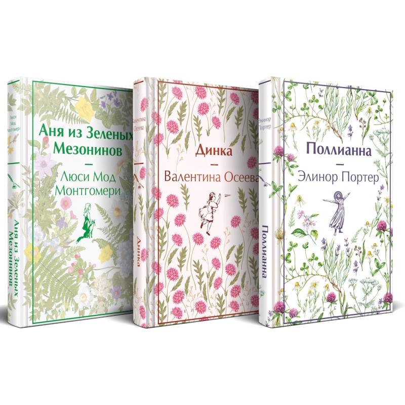 В комплект входят 3 книги: «Аня из Зелёных Мезонинов» Люси Мод Монтгомери, «Динка» Валентины Осеевой, «Поллианна» Элиноры Портер.